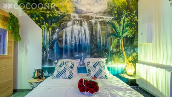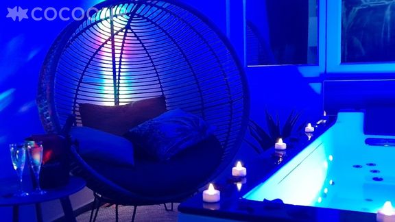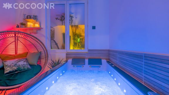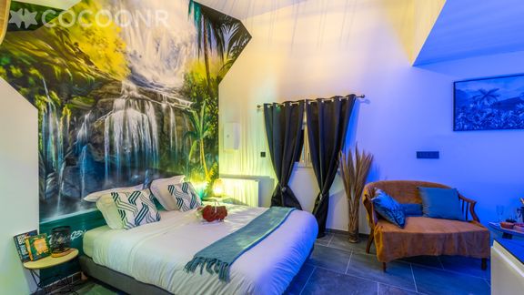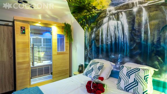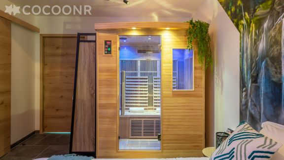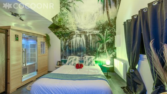- Une chambre de 26 m² avec TV et équipée d'un lit queen-size (160×200), d'un petit salon, d'un sauna et d'une baignoire balnéo spa (2 personnes) haut de gamme 68 jets (air/eau), luminothérapie et Bluetooth.