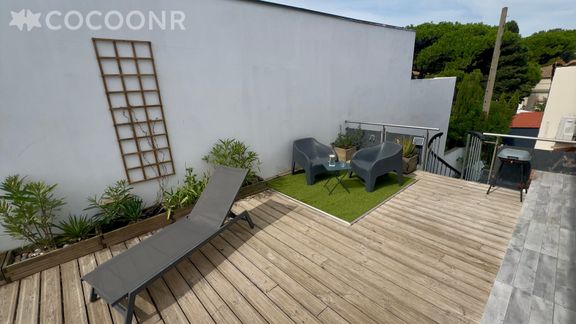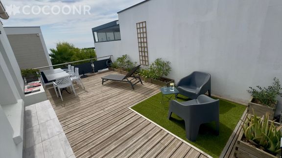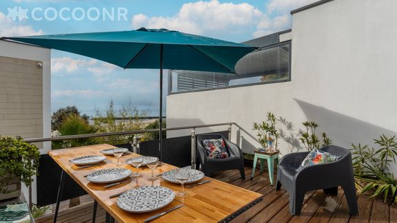 - Une jolie terrasse en bois avec une table à manger pour vos repas et apéritifs pour vous relaxer après une journée de visites, chauffé accompagné de sa jolie vue mer.