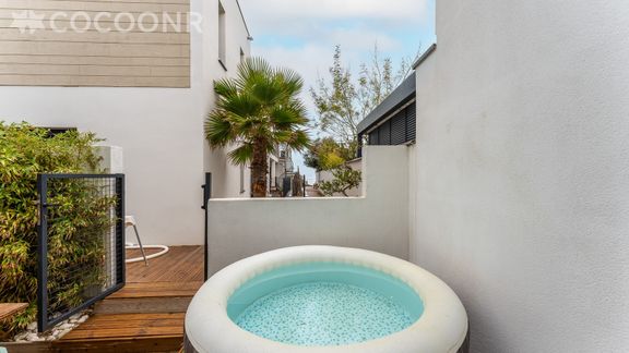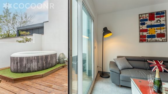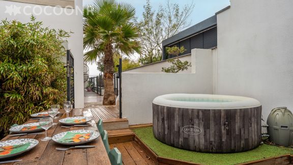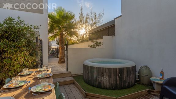 - Terrasse aménagée avec jacuzzi chauffé ainsi qu’une table à manger pour vos repas et apéritifs ainsi qu'un Spa pour vous relaxer après une journée de visites.