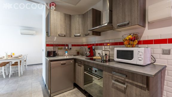 - Pièce de vie : salon TV avec grand canapé d'angle, table à manger, cuisine ouverte équipée (four, micro-ondes, lave-vaisselle, cafetière Senseo, plaques de cuisson, réfrigérateur)