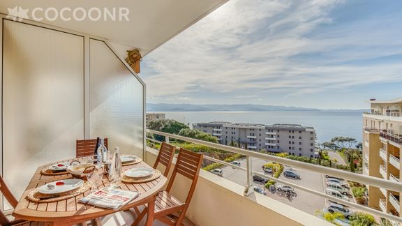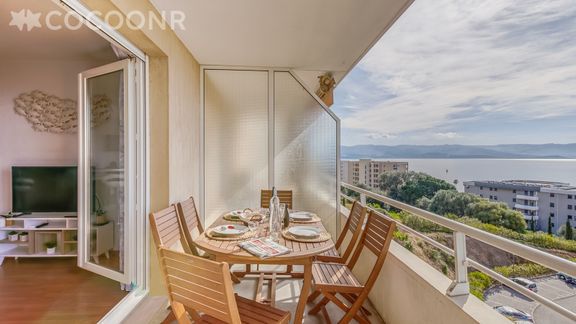 - Balcon de 10 m² exposé plein SUD, et aménagé avec table et chaises. Le balcon vous offrira une sublime vue sur le mer !