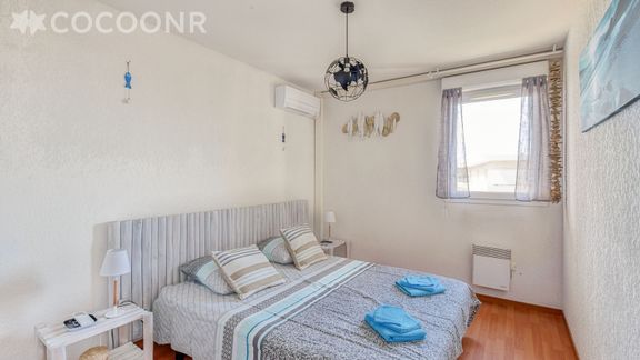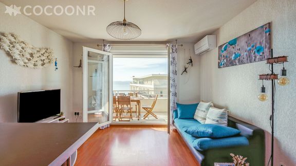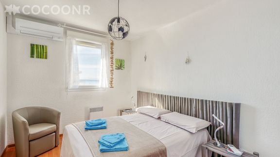 Venez séjourner dans ce magnifique appartement climatisé et doté d'une sublime vue sur la mer ! L'appartement se compose d'un grand salon séjour aménagé avec canapé et espace-repas, d'une cuisine ouverte et entièrement équipée, de deux chambres aménagées avec lits-doubles, et d'une salle de bain avec baignoire. Vous profiterez également du balcon, aménagé avec salon de jardin, idéal pour prendre vos repas en appréciant la vue ! Draps et serviettes en supplément. Parking privé sur place.