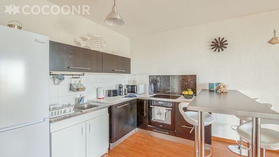 - Cuisine ouverte sur le salon et entièrement équipée : four, plaques de cuisson, réfrigérateur, micro-ondes, cafetière, bouilloire, grille-pain, vaisselle et couverts
