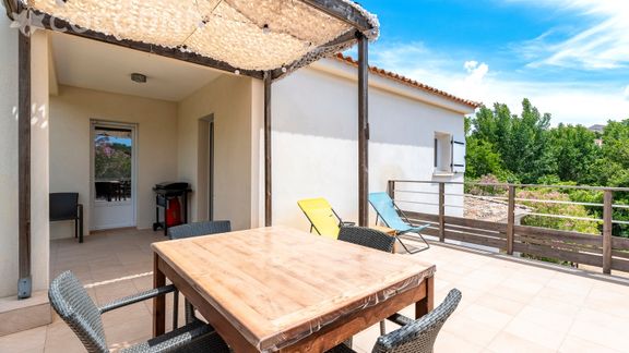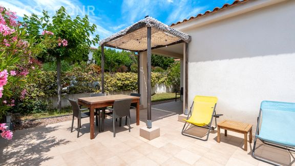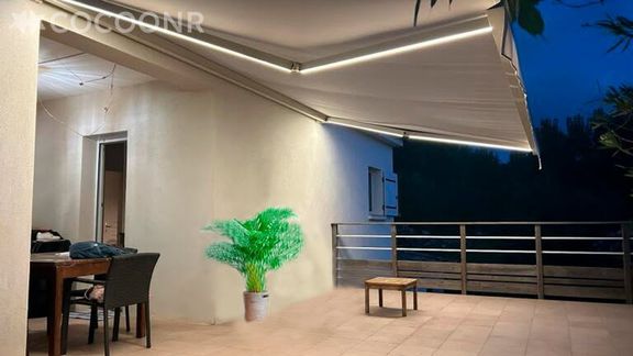 - Une terrasse de 30 m² dotée d'une pergola avec toile d'ombrage, éclairage LED solaire intégré et mobiliers