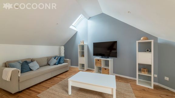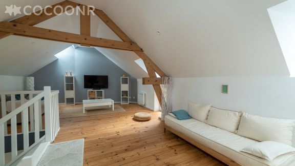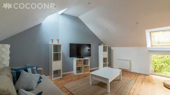 - Un salon de 50 m² avec canapé-lit double, TV et table basse