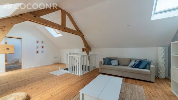 - Une pièce de vie de 50 m², incluant la cuisine ouverte, avec baies vitrées donnant sur jardin arboré
