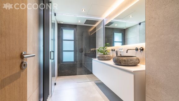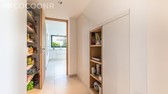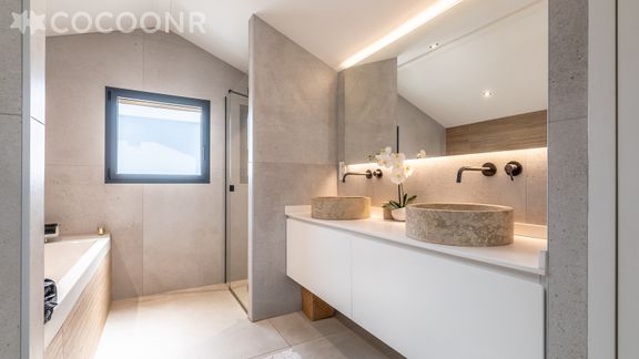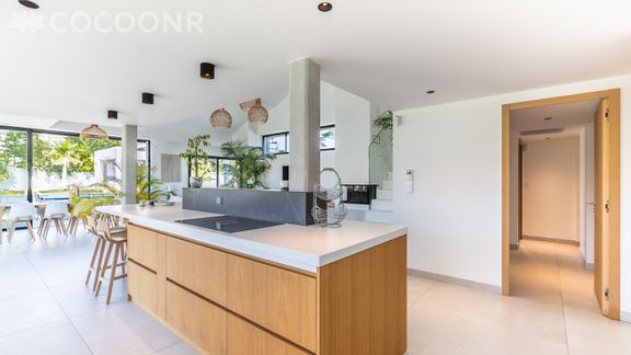 Les larges baies vitrées inondent les pièces de lumière et prolongent naturellement le séjour vers l’extérieur. Le salon spacieux, la salle à manger et la cuisine ouverte s’inscrivent dans un esprit contemporain et chaleureux, mêlant matériaux naturels et lignes épurées.