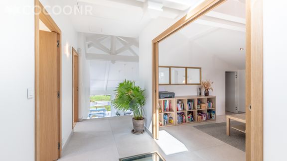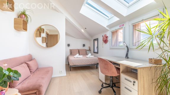 À l’étage, des chambres lumineuses à la décoration soignée offrent confort et intimité, certaines avec coin bureau baigné de lumière naturelle, parfait pour télétravailler dans un cadre inspirant.
