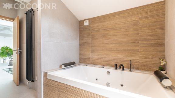 À l’extérieur, un vaste jardin paysager entoure une splendide piscine (8m x 4m) bordée de bois, complétée par un spa privatif pour des instants de pure détente. Plusieurs terrasses aménagées invitent à vivre dedans-dehors toute l’année : coin salon ombragé, espace repas convivial et transats pour se prélasser au soleil avec également une plancha.