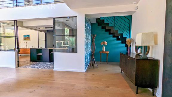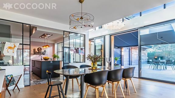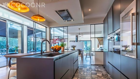 - Une grande cuisine entièrement équipée, délimitée par des verrières, avec un îlot et des tabourets