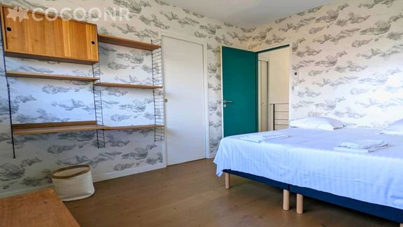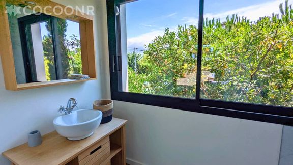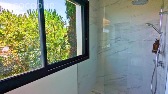 - Une suite avec un lit queen-size (160x200), salle d'eau attenante avec une douche et un lavabo. Cette chambre donne un accès direct sur le jardin et la piscine