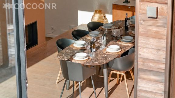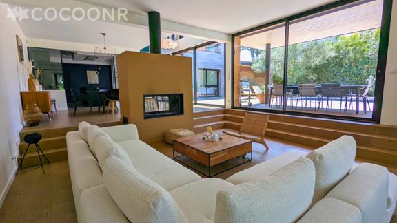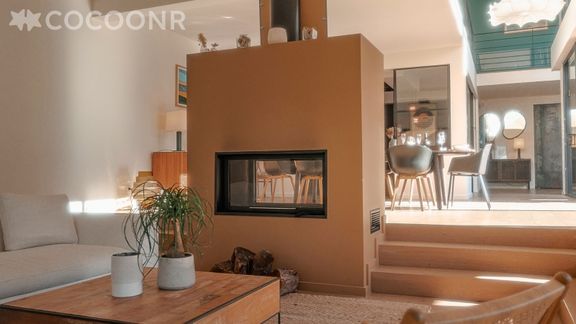 - Une grande pièce de vie lumineuse délimitée par la cheminée avec un espace salon et un espace salle à manger