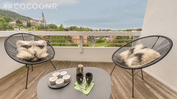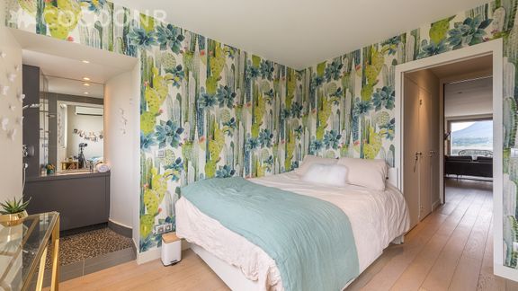 - Terrasses des deux côtés de l’appartement offrant une luminosité exceptionnelle et une vue à 360° (lac d’un côté, château et montagnes de l’autre).