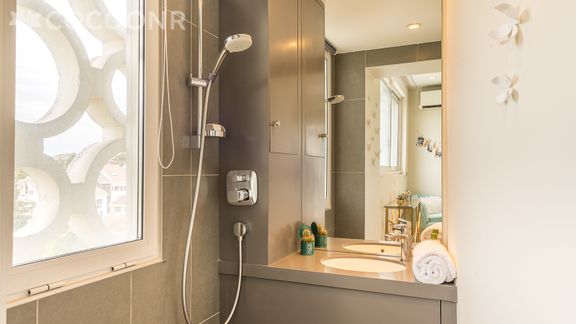 - Chambre n°2 : lit double (140x190), rangements, climatisation, salle de douche attenante avec lavabo et accès terrasse vue château.