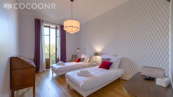- Chambre 2 : lit queen-size (160 cm), accès à un petit balcon avec vue sur la ville, placard de rangement.