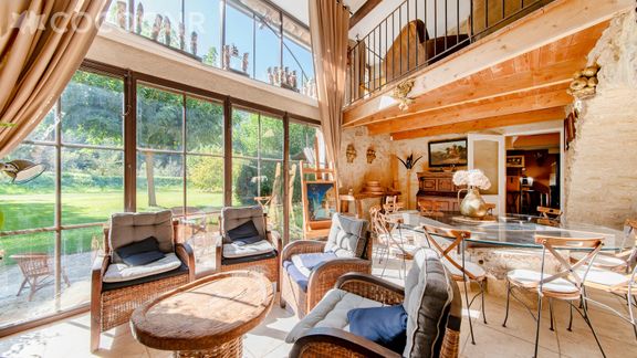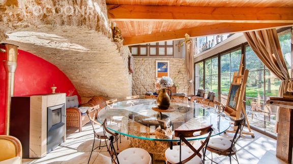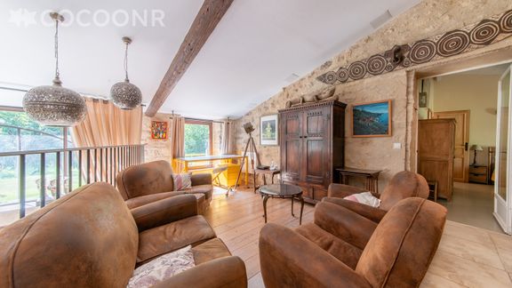 Magnifique demeure dans un magnifique endroit. Ce moulin a été restauré avec gout par un proprietaire voyageur visiblement. le salon est tres beau avec cette immense baie vitrée qui , ouverte, agrandit l'espace sur un grand et beau jardin.