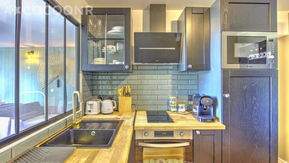 - Une cuisine ouverte équipée avec notamment : réfrigérateur, plaques à induction, micro-onde, Nespresso, bouilloire, grille-pain...