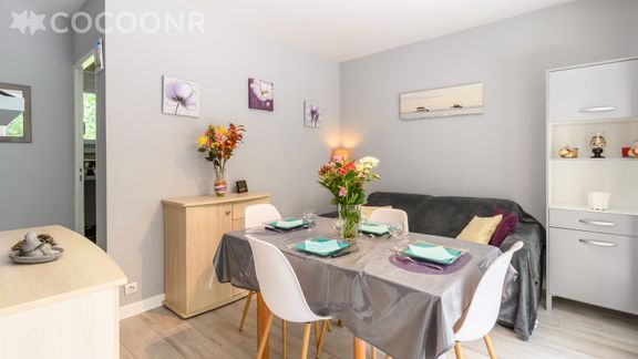 - Une pièce de vie de 17 m² avec TV, un canapé-lit double convertible et un coin repas