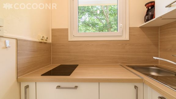 - Une cuisine équipée avec notamment : bouilloire électrique, four à micro-ondes, grille-pain, plaques de cuisson...