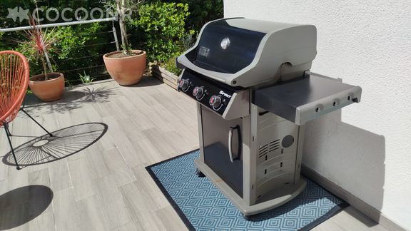 Grande table repas avec store banne électrique, large barbecue Weber.