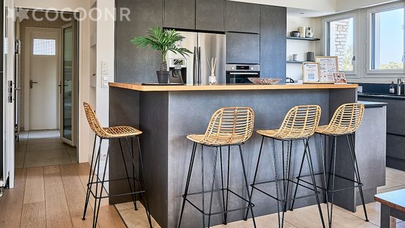 Convivialité assurée aussi autour de l’îlot central entouré de 4 tabourets hauts desquels vous pourrez assister à la prouesse de votre chef, vue directe sur la grande table de cuisson à induction et ...sur lui ...!