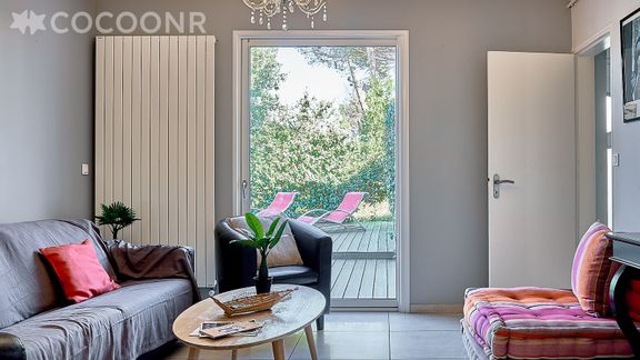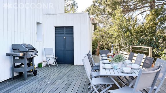 En ville d'hiver , à 10 mn à pied de la plage Pereire, un grand jardin encerclant la maison, une vaste terrasse sous les pins, fauteuils et canapé de jardin , plancha , c'est à la Villa Le Deck que vous réunirez toute votre famille ou vos amis à toute saison pour passer des vacances inoubliables sur le bassin !