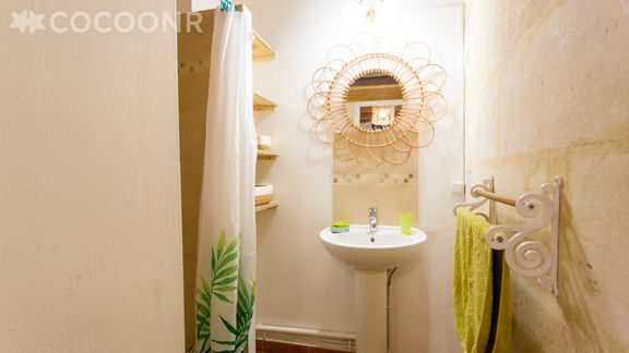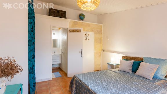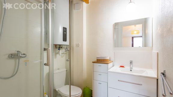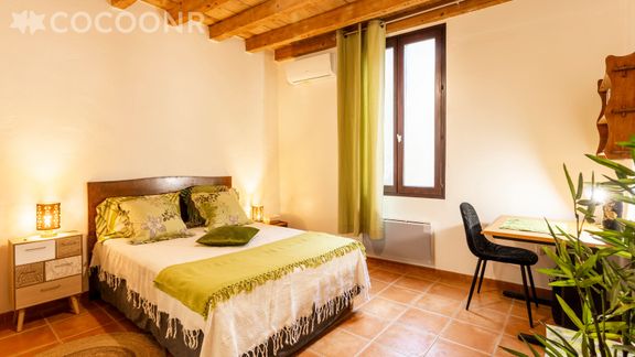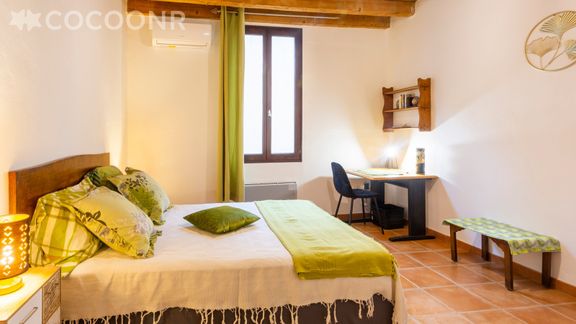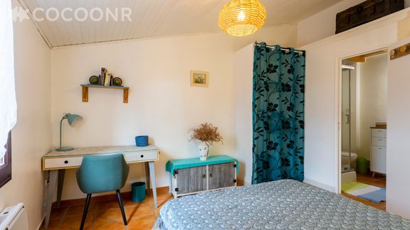 - Chambre 1 : Un lit double (140×190), un coin bureau, une salle d'eau avec douche et un placard