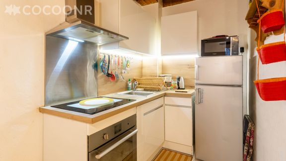 - Une cuisine équipée avec notamment : bouilloire électrique, four, four à micro-ondes, grille-pain, plaques de cuisson...