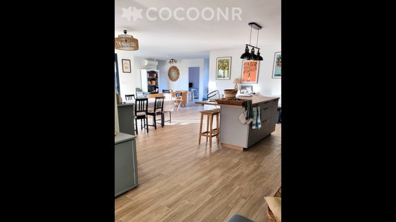 - Une pièce de vie de 55 m² avec espace salon (canapé et fauteuils), salle à manger et cuisine