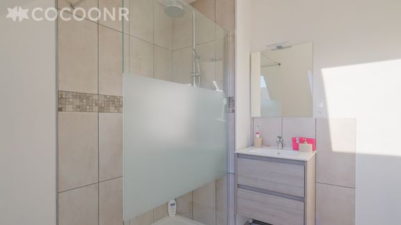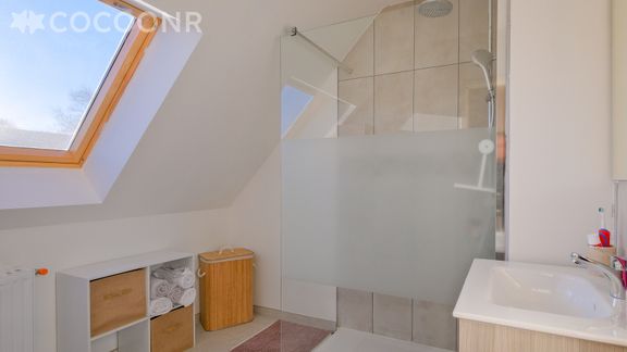 - Une salle de bain avec douche, meuble vasque