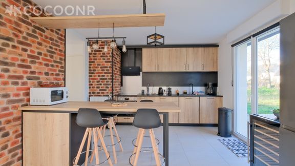 - Une cuisine ouverte équipée avec notamment : bouilloire électrique, four, four à micro-ondes, grille-pain, lave-vaisselle, plaques de cuisson et coin repas
