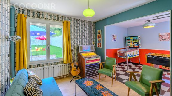 - Une pièce de vie avec coin salon ouvert sur une salle de jeux (jukebox de 1967, flipper de 1969 et d'un babyfoot). Un canapé convertible en lit d'appoint si besoin, TV avec abonnement Netflix