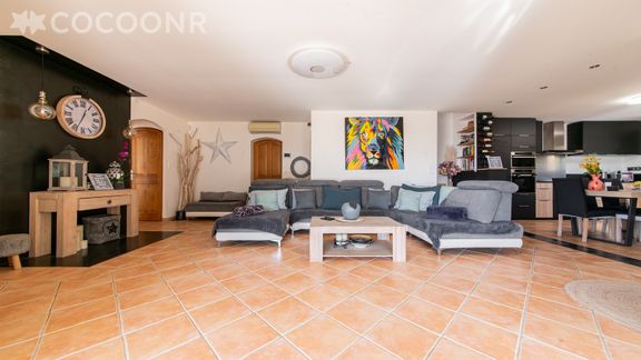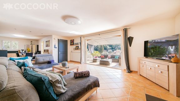 - Une pièce de vie 40 m² avec canapé, TV, accès direct à la terrasse