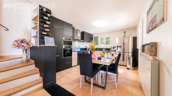 - Une cuisine équipée ouverte sur le salon avec notamment : bouilloire électrique, four, four à micro-ondes, cafetière Nespresso, Thermomix, grille-pain, lave-vaisselle, plaques de cuisson...