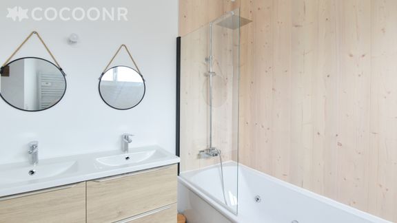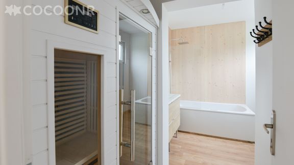 - Une salle de bain avec double vasque, baignoire balneo et sauna
