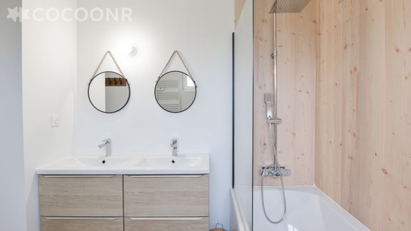 - Une salle de bain avec double vasque, baignoire balneo et sauna