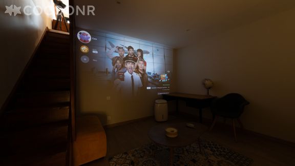- Un espace cinéma avec canapé-lit double et vidéoprojecteur