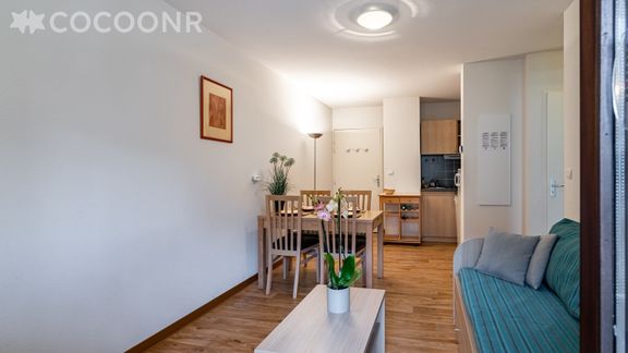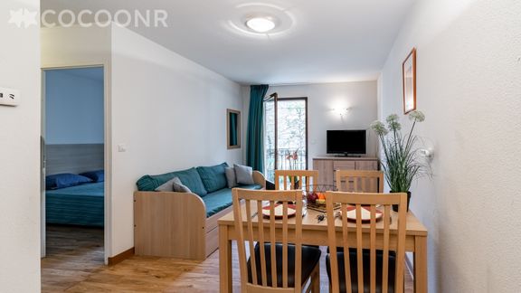 - Une pièce de vie avec un coin salon doté d'un canapé-lit double, une table basse, une TV ainsi qu'un espace repas avec une table à manger pouvant accueillir jusqu'à 4 convives.