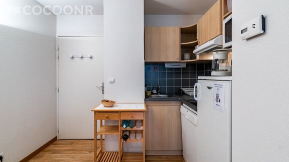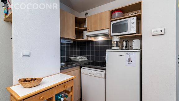 - Une kitchenette ouverte sur le salon, entièrement équipée : réfrigérateur, lave-vaisselle, petit congélateur, plaques de cuisson, machine à fondue et raclettes, micro-ondes, grille-pain, bouilloire, cafetière à filtre et Tassimo Happy..