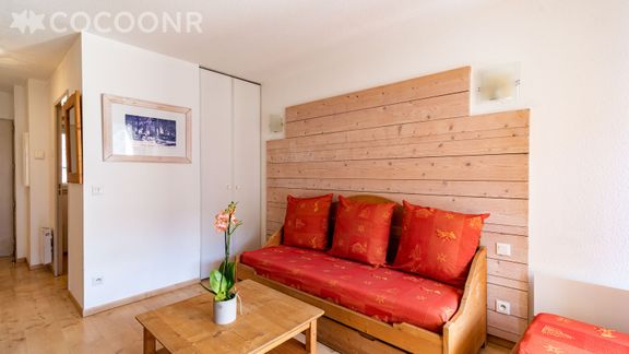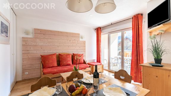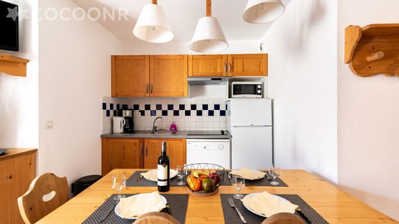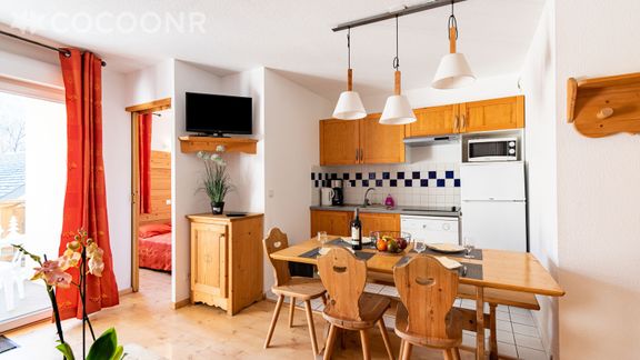 Ce logement, pouvant accueillir jusqu'à 6 personnes, dispose d'une belle pièce de vie avec un canapé-lit double, une kitchenette entièrement équipée, deux chambres, une salle de bain, un balcon avec vue sur le sommet du Port du Vénasque ainsi que des tables de ping-pong, un terrain de basket et un terrain de pétanque !