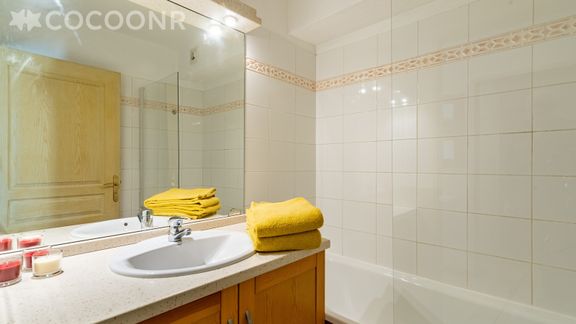 - Une salle de bain avec une baignoire, une vasque, un sèche-cheveux.