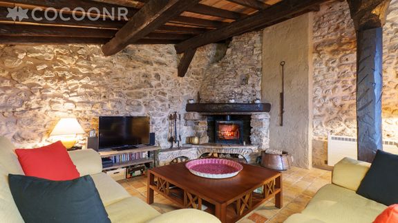 - Une pièce de vie de 40 m² avec TV, cheminée décorative et canapés
