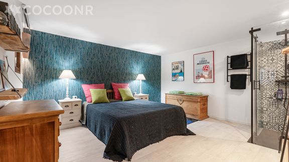 - Chambre 1 : avec un lit queen-size (160×200) et une salle d'eau ouverte (avec douche et lavabo)