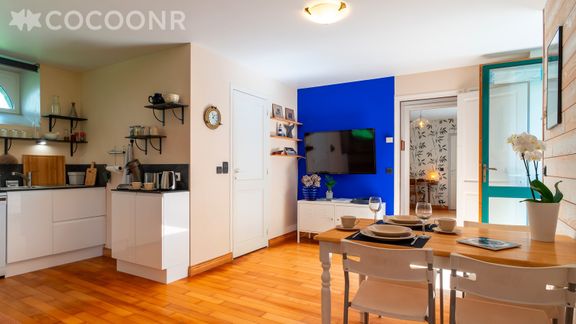 - Une pièce de vie de 22 m² avec une TV, un canapé-lit double (haut de gamme 160x200) et un coin repas