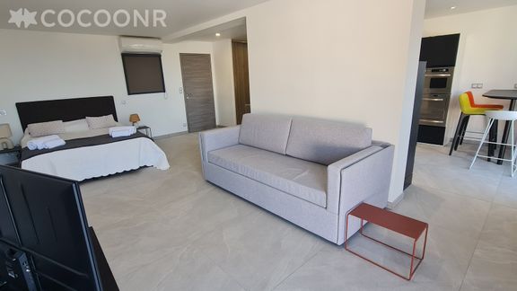 - Une suite équipée d'une kitchenette (avec un frigo, des plaques, une machine à glaçons et un lave-vaisselle), d'une chambre avec un lit queen-size (160x200) et d'une salle d'eau attenante avec WC