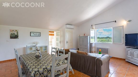 - Une pièce de vie climatisée de 80 m² avec canapé-lit double, TV et coin repas