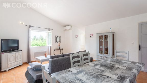 - Une pièce de vie climatisée de 80 m² avec canapé-lit double, TV et coin repas