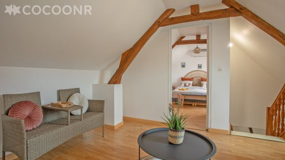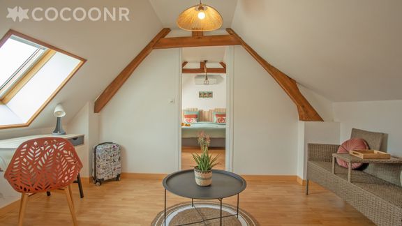 - Un espace bureau cosy avec canapé sur le palier, parfait pour télétravailler ou se détendre.
