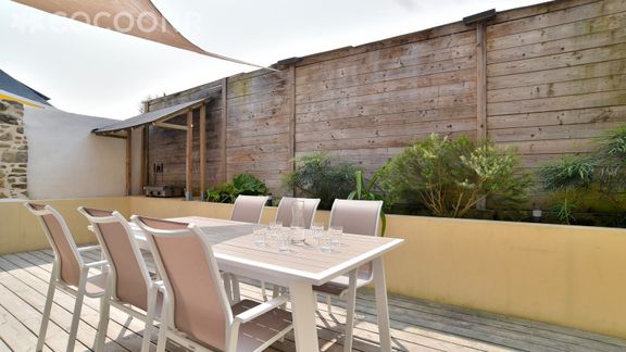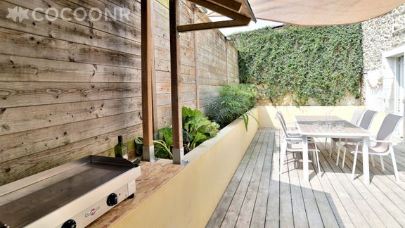 - Une terrasse de 40m2 avec table de jardin et chaises (pour 12 personnes) ainsi qu'un salon de jardin avec canapés et fauteuils mis à disposition et une plancha pour profiter des beaux jours