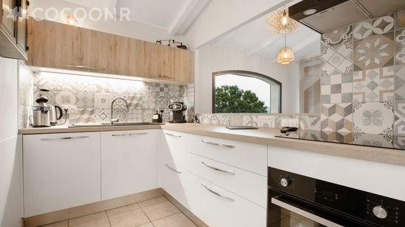 - Une cuisine équipée avec notamment : bouilloire électrique, machine à café, four à micro-ondes, grille-pain, lave-vaisselle, plaques de cuisson...